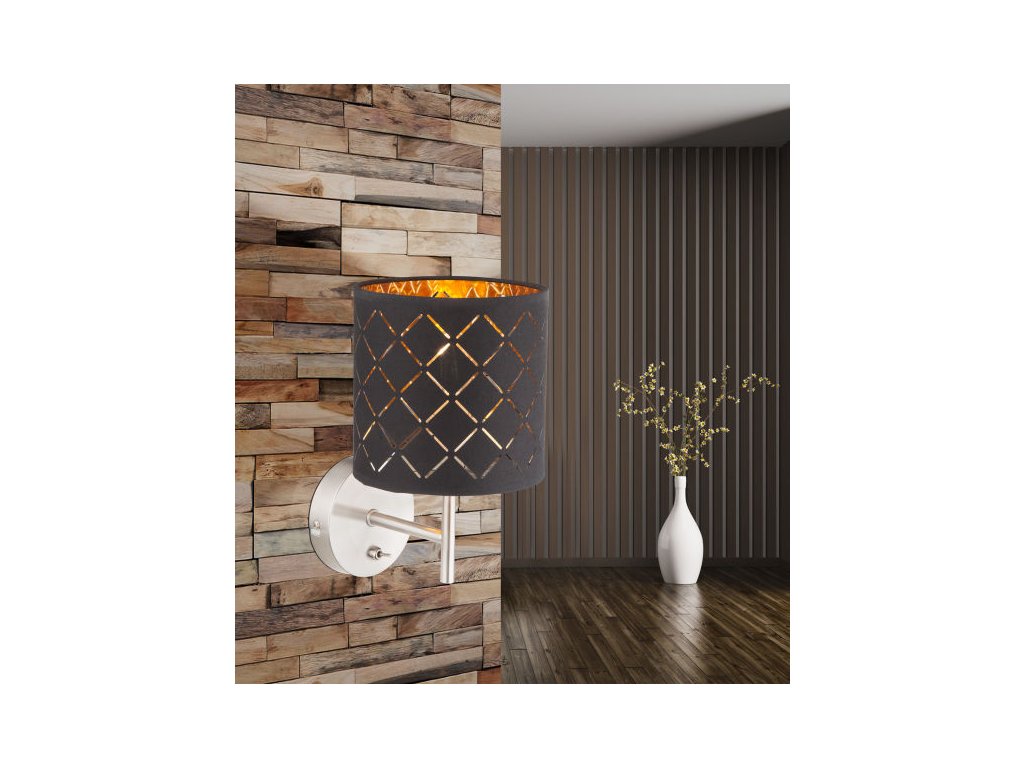 Nástěnné svítidlo, kov nikl matný, textil černý a zlatý, stínítko s ozdobným děrováním, vypínač, ŠxV: 150x260, H: 190, bez žárovky 1xE14, max. 40W 230V.